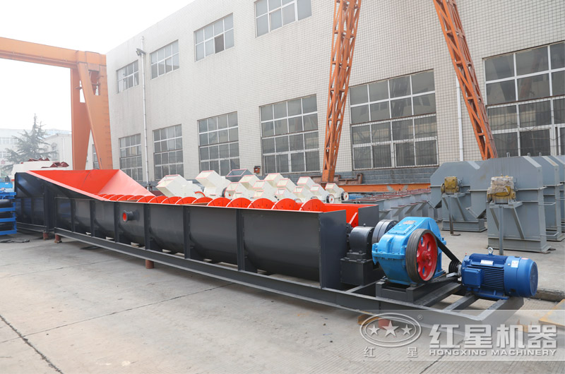 2、螺旋洗石機(jī)體型較長(zhǎng),采用臥式結(jié)構(gòu)布置,處理量也更大,多用于大型砂廠,該設(shè)備使用螺旋推進(jìn)石子而使石子與水和泥土分離,因而石子干凈但產(chǎn)量略低。